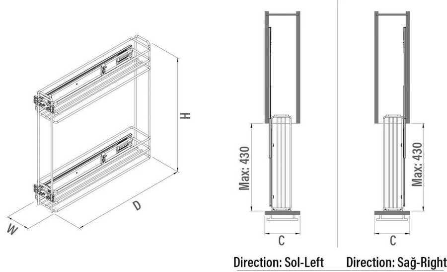 | Ürün Kodu | W x D x H (mm) | C (mm) | Hacim (m³) | Ağırlık kg. | |||