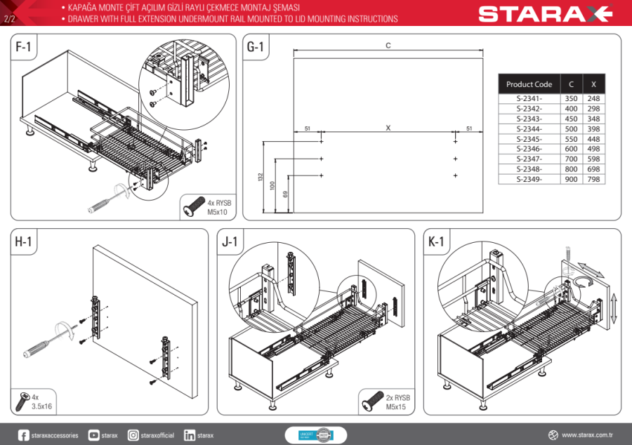 S-2345-C Kapağa Mont. Çift Açılım Gizli Raylı Çekmece 55 cm Krom